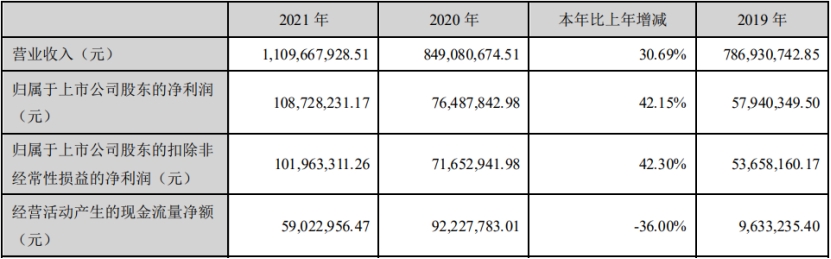 根据优宁维4月25日披露的2021年年度报告,2021年,公司实现营业收入11.10亿元,同比增长30.69%;实现归属于上市公司股东的净利润1.09亿元,同比增长42.15%;实现归属于上市公司股东的扣除非经常性损益的净利润1.02亿元,同比增长42.30%;经营活动产生的现金流量净额为5902.3万元,同比减少36.00%。