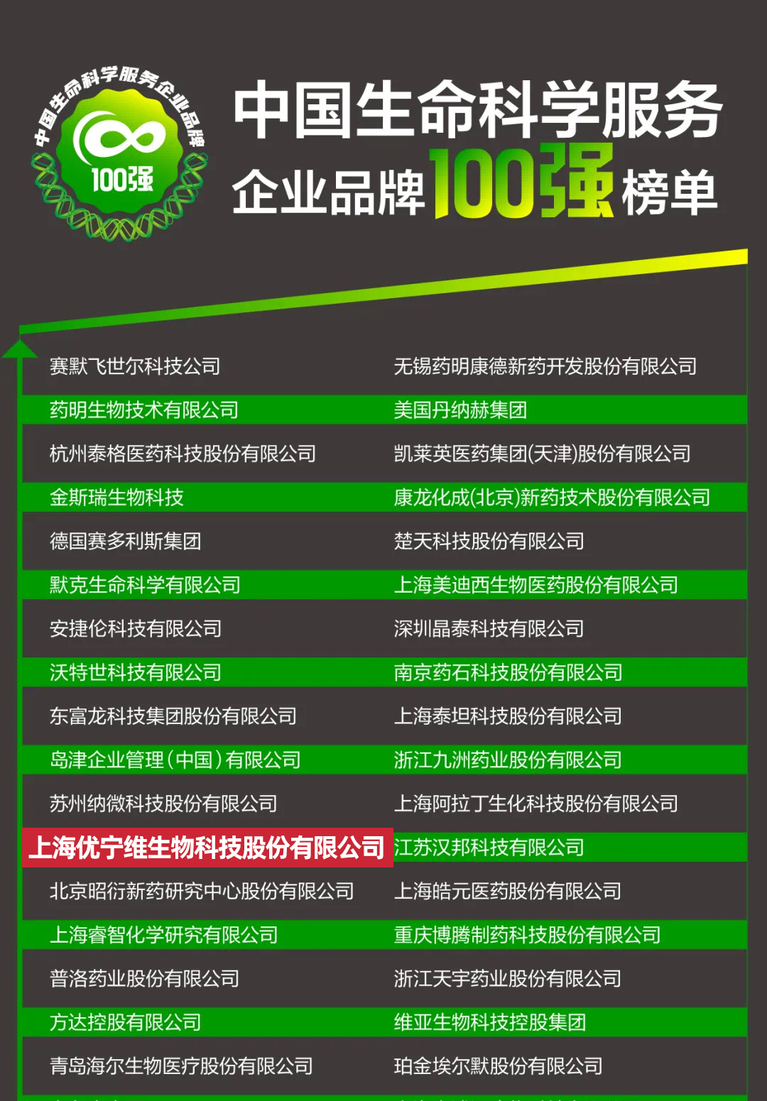 近日,医药行业媒体E药经理人公布“2022中国生命科学服务企业品牌100强”名单,上海优宁维生物科技股份有限公司(以下简称“优宁维”)入围榜单。