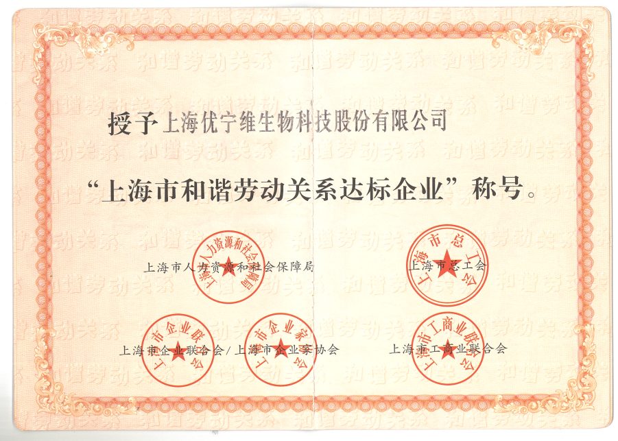 近日,上海优宁维生物科技股份有限公司(以下简称“上海优宁维”)被上海市人力资源和社会保障局、市总工会、市企业联合会/市企业家协会、市工商业联合会联合授予“上海市和谐劳动关系达标企业”的荣誉称号。