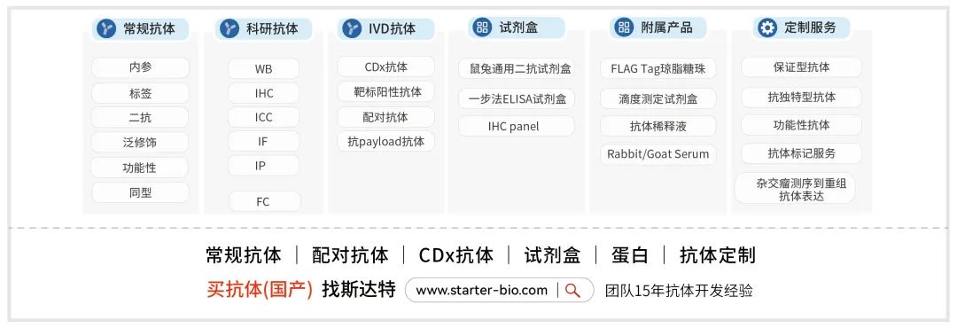 杭州斯达特专注于抗体研发和制造,其核心团队深耕抗体研发十五年,提供优质的抗体、蛋白、试剂盒和定制服务,包括科研抗体、CDx和IVD抗原和抗体原料、一步法ELISA试剂盒、鼠兔通用二抗试剂盒以及其他用途的免疫试剂整体解决方案。公司建立了多物种单B细胞抗体开发平台(兔单抗,鼠类单抗等)、传统鼠单抗、重组蛋白表达平台及完善的抗体应用验证和检测体系(包括免疫层析,酶联免疫,流式分析,免疫组化,免疫印迹,免疫荧光,免疫沉淀等)。已正式通过欧盟98/79/EC认证、ISO9001认证和ISO13485认证。