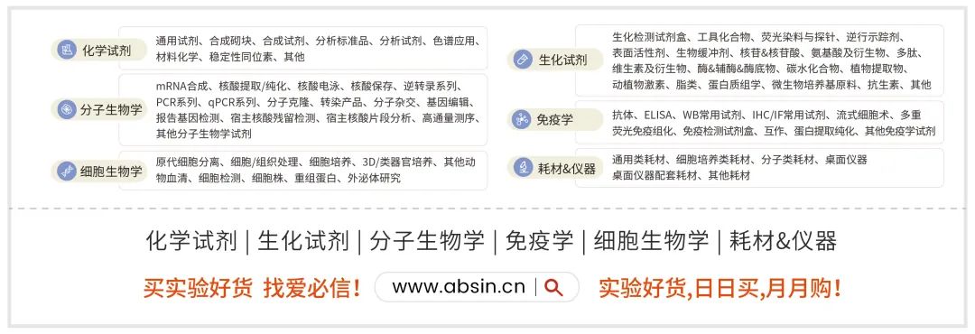 爱必信ABSIN-生命科学百宝箱Σ,为生命科学研究提供试剂、耗材等科研工具产品。涵盖6大产品线:生化试剂、化学试剂、分子生物学试剂、细胞生物学试剂、免疫学试剂和耗材仪器,以及各种定制服务等。截止2025年3月产品引用文献发表已超12700+篇。