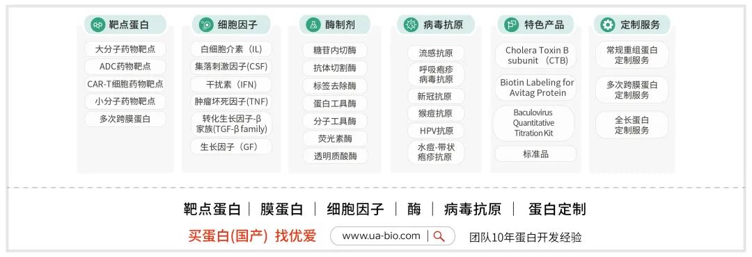 UA BIOSCIENCE(优爱)专注于重组蛋白研发,凭借团队10年蛋白开发经验,为生命科学领域提供基础科研、药物研发、细胞治疗、基因治疗等领域提供各种蛋白类试剂原料,包括靶点蛋白、细胞因子、工具酶等,致力于为生命科学领域客户提供优质的产品和专业服务。