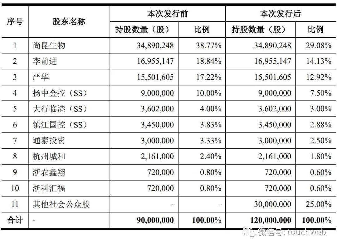 IPO后,尚昆生物持股为29.08%,李前进直接持股为14.13%,严华直接持股为12.92%,扬中金控(SS)持股为7.5%,大行临港(SS)持股为3%,镇江国控(SS)持股为2.88%,通泰投资持股为2.5%,杭州城和持股为1.8%。