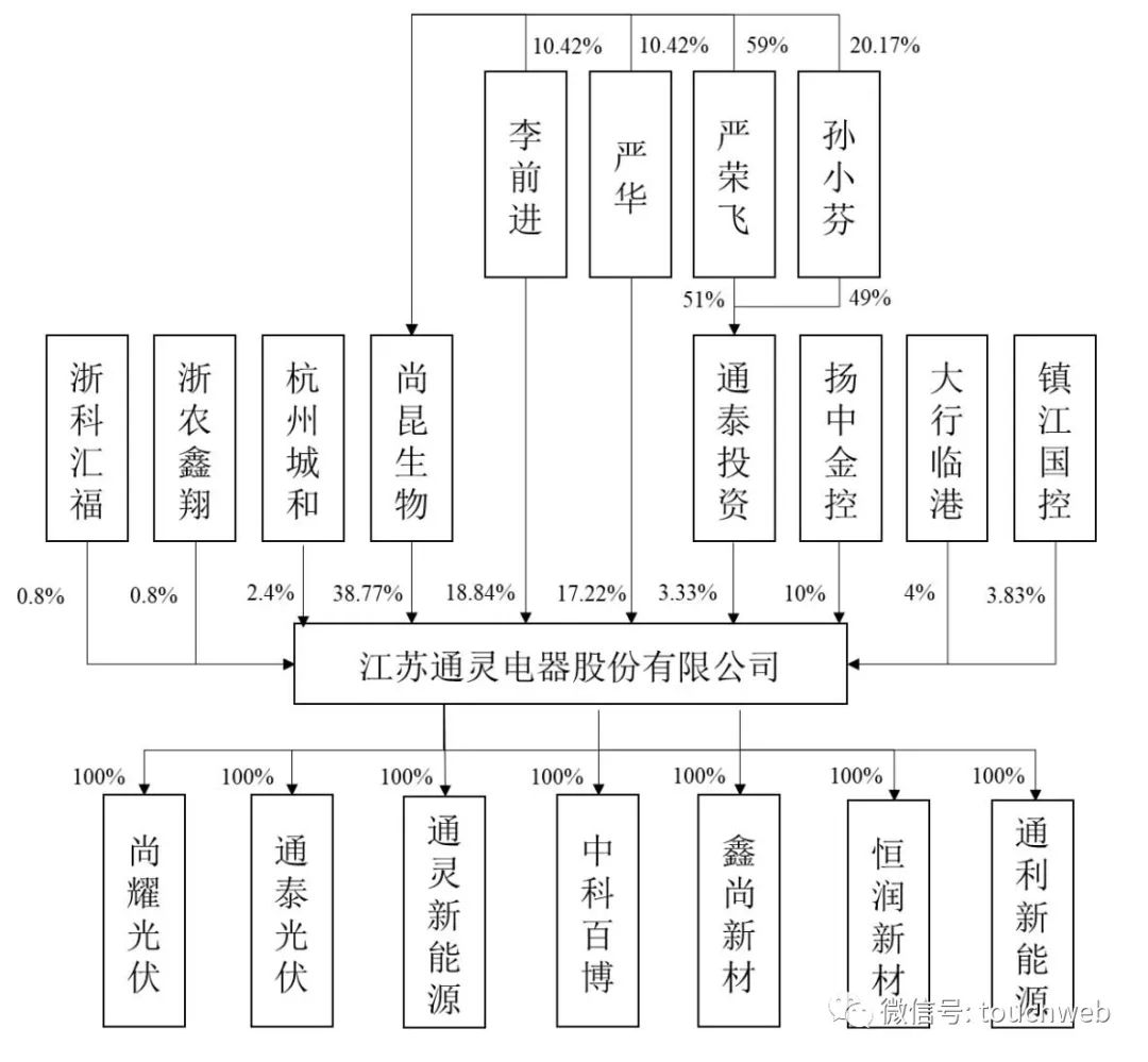 IPO前,严荣飞与其妻孙小芬、其女严华、其女婿李前进合计持有尚昆生物100%出资份额,严荣飞、孙小芬合计持有通泰投资100%出资份额;尚昆生物持有公司38.77%股权;通泰投资持有公司3.33%股权;