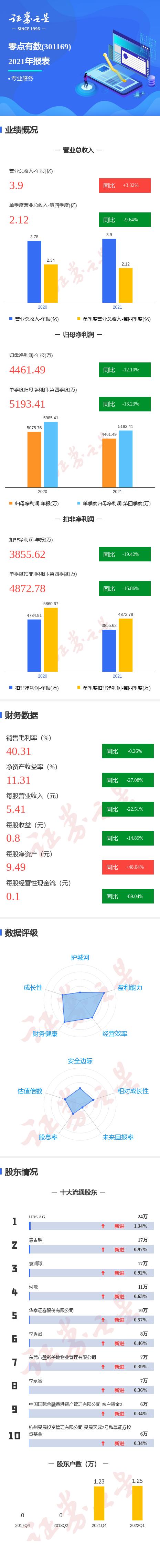 零点有数2021年报显示,公司主营收入3.91亿元,同比上升3.32%;归母净利润4461.5万元,同比下降12.1%;扣非净利润3855.62万元,同比下降19.42%;其中2021年第四季度,公司单季度主营收入2.12亿元,同比下降9.64%;单季度归母净利润5193.42万元,同比下降13.23%;单季度扣非净利润4872.79万元,同比下降16.86%;负债率15.71%,投资收益130.47万元,财务费用-607.3万元,毛利率40.31%。