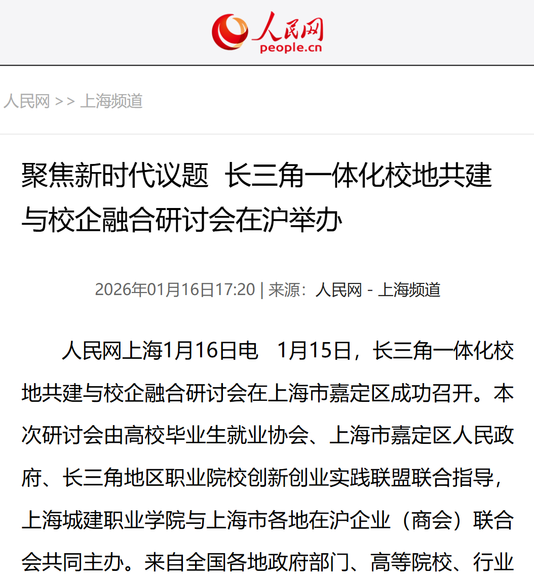 1月15日,长三角一体化校地共建与校企融合研讨会在上海市嘉定区成功召开。本次研讨会由高校毕业生就业协会、上海市嘉定区人民政府、长三角地区职业院校创新创业实践联盟联合指导,上海城建职业学院与上海市各地在沪企业(商会)联合会共同主办。来自全国各地政府部门、高等院校、行业企业、社会组织的百余位代表齐聚一堂,聚焦新时代校地共建与校企融合的核心议题,共商长三角地区人才培养与产业协同创新路径,为区域更高质量一体化发展凝聚智慧、汇聚合力。