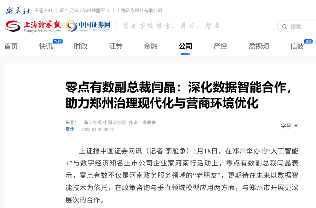 智汇中原,数创未来!在“人工智能+”与数字经济的浪潮中,零点有数受邀参与上海证券报企业家河南行活动,与郑州共话合作新篇。凭借在营商环境评估、社会治理等领域的深厚积累,以及政务服务垂直模型的技术突破,我们将全力为郑州各级政府部门提供决策支持,以数据智能点亮城市治理与产业发展的新路径,不负信赖,共创佳绩。本文转载自上海证券报。