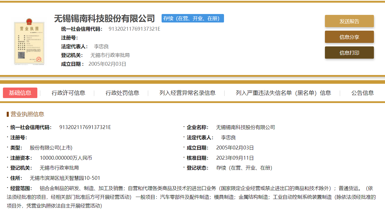 据查,锡南科技成立于2005年2月,法定代表人为李忠良,经营范围含汽车零部件及配件制造;模具制造;金属结构制造等。目前该公司由李忠良持股51.15%、李明杰持股8.86%。