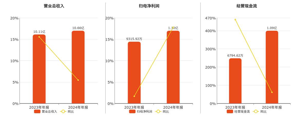 公司营业总收入为10.66亿元。归母净利润为1.10亿元。经营活动现金净流入为1.09亿元。