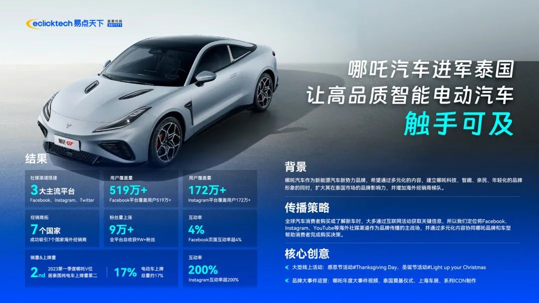为此,易点天下通过前期大量的市场调研和用户洞察,仅120天从0-1为哪吒汽车打造海外社媒平台,快速开启Facebook、Instagram、Twitter3大主流平台的品牌运营。通过日常贴文发布、定期线上活动策划以及品牌广告投放,全平台总收获近10w粉丝;成功吸引7个国家的海外经销商,形成大规模的销售战略布局;Facebook平台覆盖人群约519万,Instagram覆盖人群也接近200万,在泰国市场成功打造出哪吒汽车可靠、领先、智能、年轻化的品牌形象。