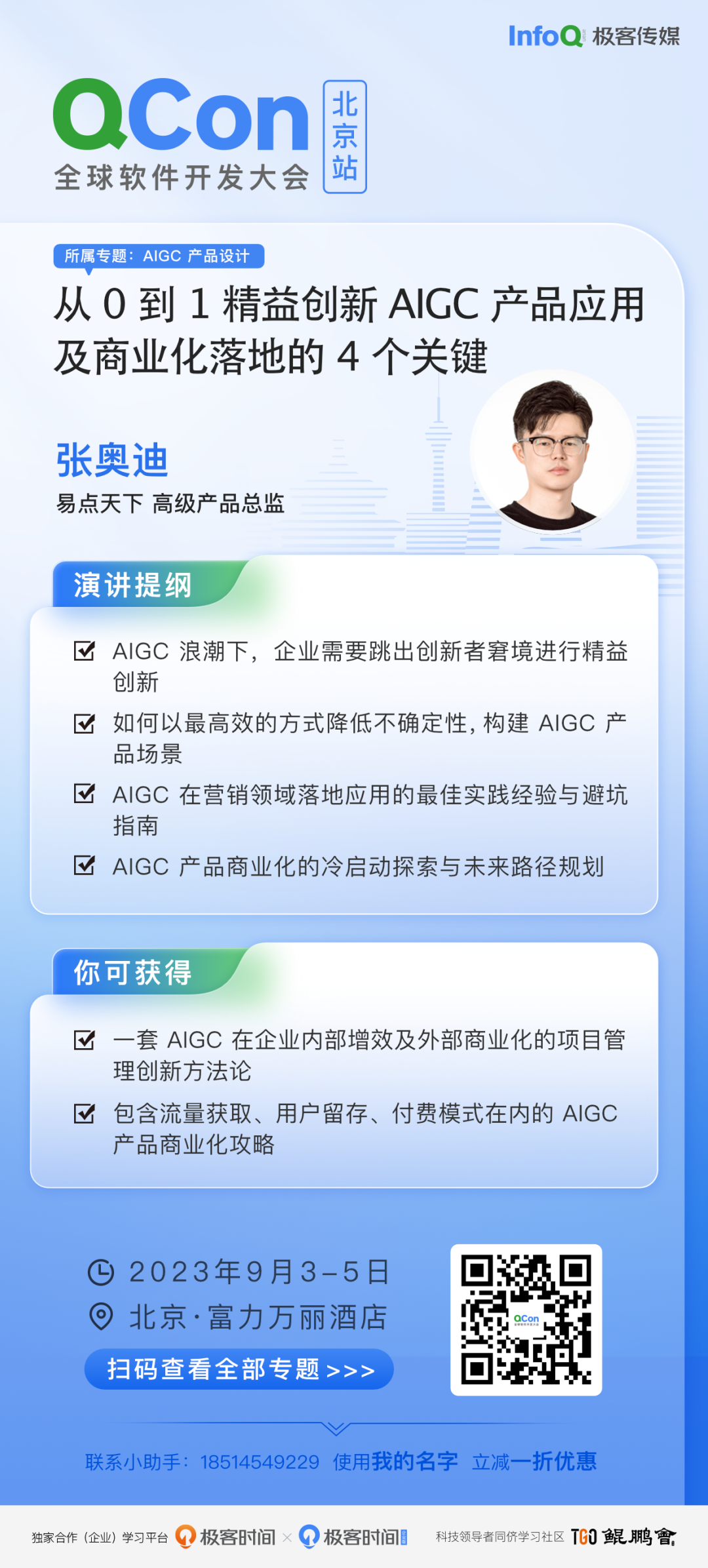 9月4日下午,在QCon全球软件开发大会“AIGC产品设计”专题,易点天下高级产品总监Aodi Zhang将结合易点天下AIGC数字营销创作产品最新落地实践成果及商业化路径,以《从0到1精益创新 AIGC产品应用及商业化落地的4个关键》为主题,为大家带来AIGC产品设计理念、场景构建、落地避坑指南、商业化冷启动等多个维度的干货分享。