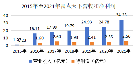 2016年至2021年,易点天下的营业收入从1.27亿元,增长至34.25亿元,增长了25.9倍;净利润从2325万元,增长至2.585亿元,增长了10.1倍。