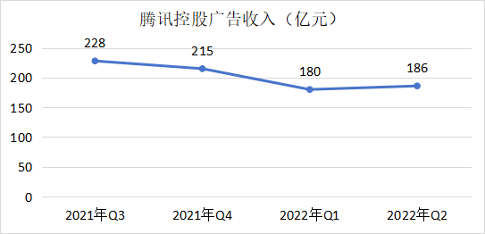 以腾讯控股(00700)为例,2022财年网络广告业务实现收入为827亿元,同比下降6.7%。2021年Q3到2022年Q2四个季度公司的广告收入更是出现了持续下滑,分别为228亿元、215亿元、180亿元和186亿元。