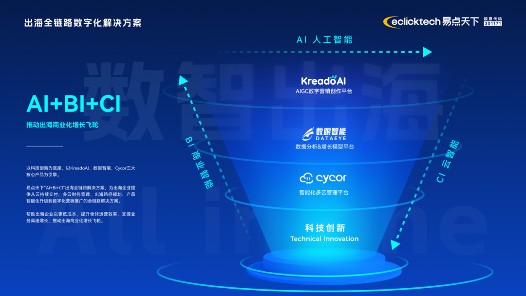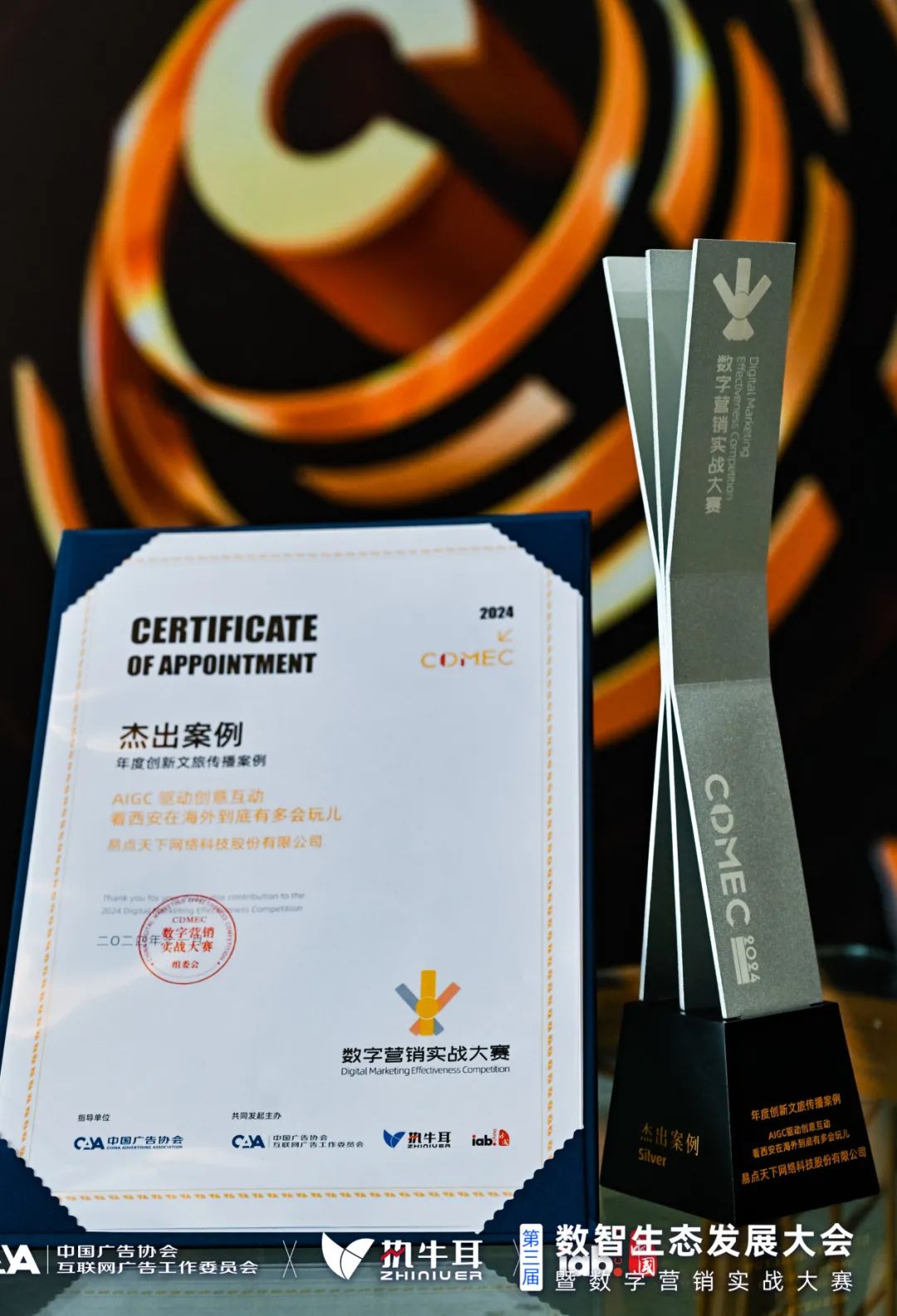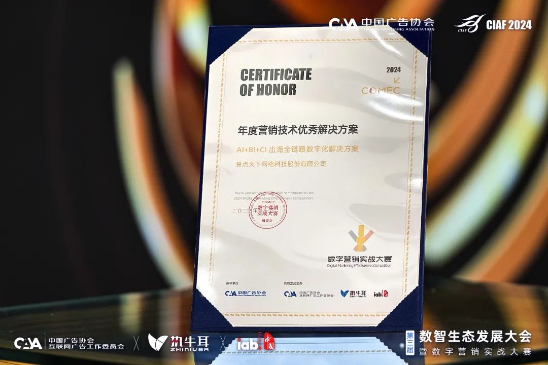 2024年5月,易点天下发布“AI+BI+CI出海全链路数字化解决方案”,一站式解决出海企业从营销素材制作、营销数据分析到营销预算管理再到云基础设施数字化与智能化的各项需求,助力其在全球市场高效实现增收增利。截至目前,该方案已服务包括阿里巴巴、上汽大众、中兴通讯、携程旅行等多家知名企业,也相继入选并获得服贸会成果发布、数贸会先锋奖银奖、非凡产研2024 CHINA AIGC100等多项荣誉。