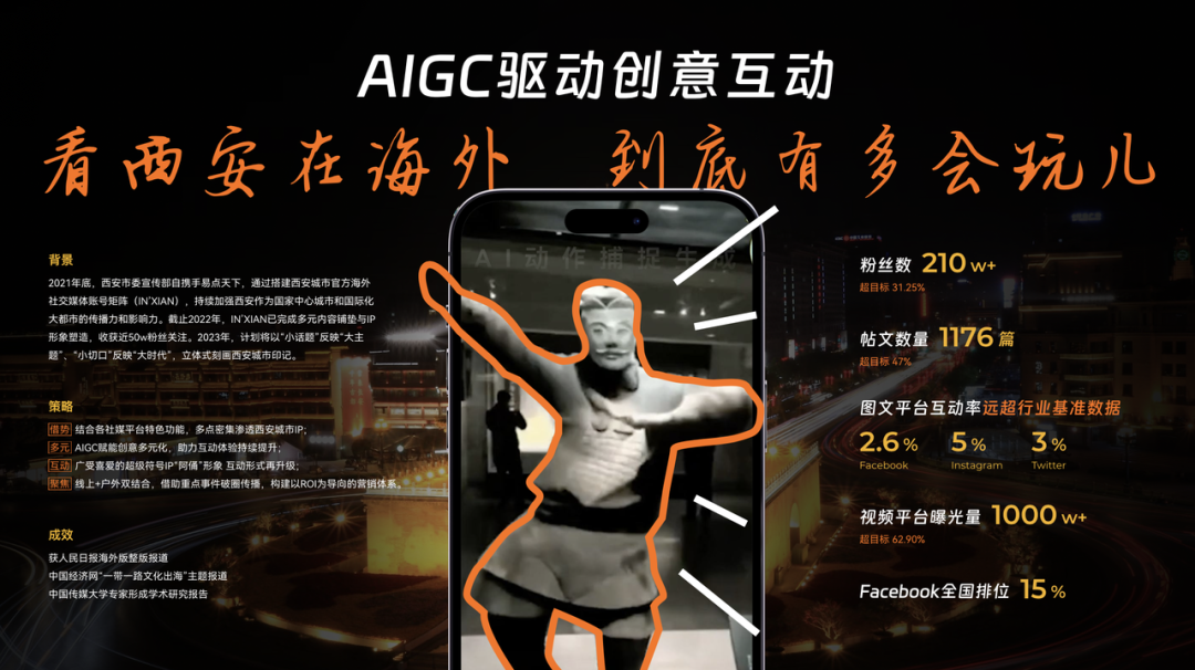 INXIAN 作为Cyberklick服务多年的西安城市外宣项目,从 IP 打造、创意策划、社媒运营,再到跨境直播、网红营销、广告优化,在为INXIAN提供全案营销服务中的每个环节,以及沉淀出的多项服务成果,无不体现Cyberklick在多领域出海解决方案的落地实力。近年来,INXIAN项目也不断收到来自金投赏商业创意奖、ADMEN国际大奖、上海国际广告奖等行业奖项认可,以及人民日报、新华社等多家媒体的专题报道。Cyberklick作为易点天下旗下商业智能化数字营销平台,此次服务项目入选年度创新文旅传播杰出案例,也是对Cyberklick服务能力的再一次肯定。