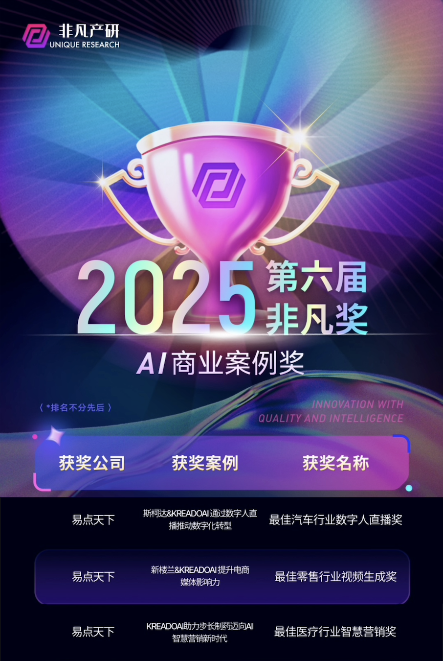 此次非凡奖的三项加冕,既是对过往成绩的肯定,更是通向未来的起点。在AI技术重构商业价值的浪潮中,易点天下KreadoAI正以领航者姿态,加速推进数智化转型的行业新篇章。