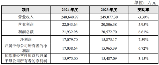 2024年毓恬冠佳营业收入为240,640.97万元,同比下降3.39%;净利润为17,079.70万元,同比增长7.59%;归属于母公司所有者的净利润17,038.64万元,同比增长6.72%;扣除非经常性损益后归属于母公司所有者的净利润15,975.00万元,同比增长3.15%;经营活动产生的现金流量净额为7,398.98万元,同比下降73.74%。