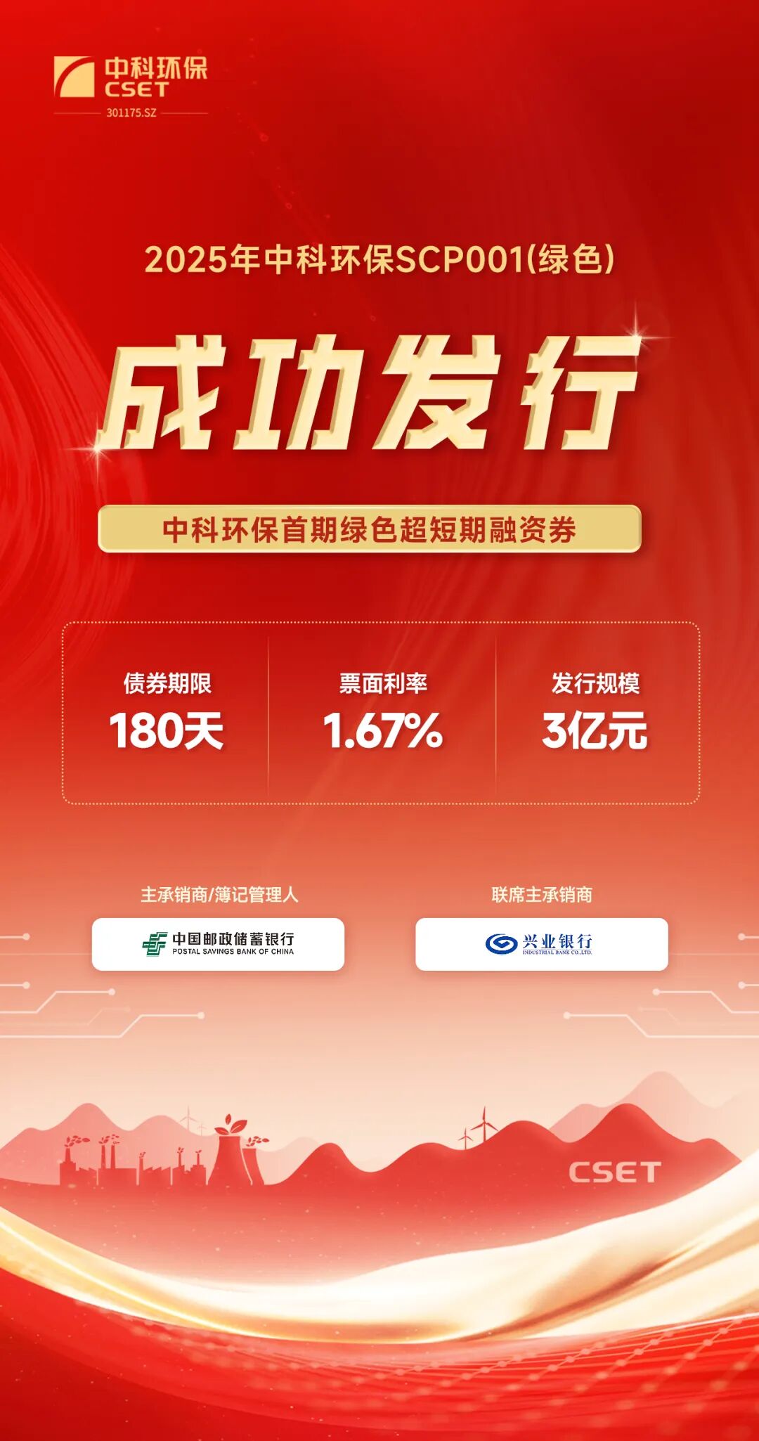 近日,中科环保成功发行2025年度首期绿色超短期融资券——“25中科环保SCP001(绿色)”,标志着公司在绿色金融与可持续发展道路上迈出关键一步。