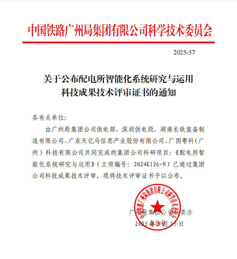 近日,广东天亿马信息产业股份有限公司(下称“天亿马”)携手控股子公司广图粤科等单位共同完成的科研项目《配电所智能化系统研究与运用》顺利通过广铁集团科技成果技术评审,荣获技术评审证书,并获得专家组的一致高度评价。该系统在铁路配电领域的成功应用,实现了配电所的智能化运行,标志着我国在智能供电运维技术方面取得新的突破,对提升铁路能源系统智能化水平具有重要意义。