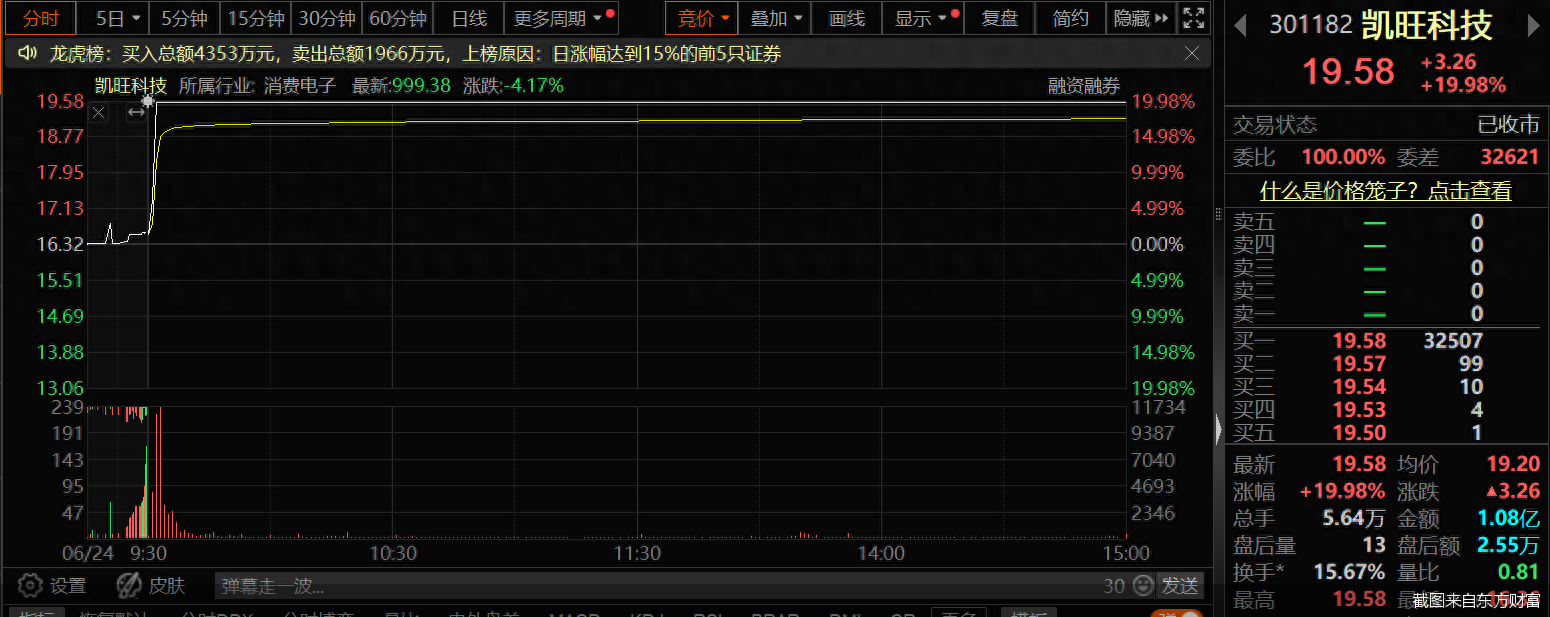 交易行情显示,6月24日,凯旺科技高开1.35%,开盘后在大量买单的推动下公司迅速封至涨停。截至当日收盘,凯旺科技报涨停价19.58元/股,总市值为18.76亿元,当日成交金额1.08亿元。