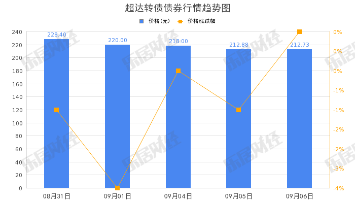 乐居财经 09月07日,“超达转债”(123187)下午盘拉低,截至14:10,跌幅12.42%,报186.30元。总成交量16.44万手,成交额3.21亿元。
