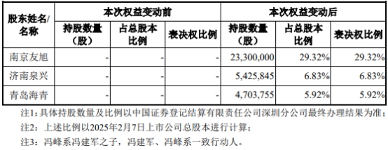 同日,公司控股股东冯建军与南京友旭签署了《表决权放弃协议》,根据《表决权放弃协议》的约定,自冯建军与南京友旭所签署的《股份转让协议》中约定的标的股份完成过户登记之日起,冯建军将放弃其合法持有的全部剩余公司股份(共计11,570,400股股份)对应的表决权。本次交易完成后,冯建军及其一致行动人冯峰(冯建军之子)合计持有公司6.29%表决权。南京友旭、济南泉兴、青岛海青之间不存在关联关系。
