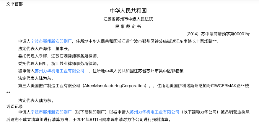 然而,力华机电被股东新安印刷厂以吊销营业执照后却逾期不成立清算组进行清算为由,于2014年8月1日向江苏省苏州市中级法院申请对力华机电进行强制清算。