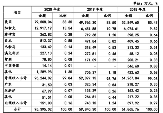 招股书数据显示,欧圣电气出口产品主要销往北美、欧洲等境外市场,2018年-2020年,欧圣电气来自境外的销售收入分别为6.13亿元、5.91亿元和9.52亿元,占主营业务比例分别高达99.03%、98.76%和99.84%。其中,美国为欧圣电气的核心市场,2020年公司对美国地区的销售金额为7.95亿元,占主营业务收入比例高达83.35%。