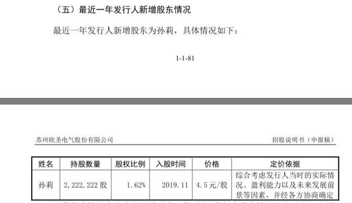 据招股书显示,2019年10月21日,欧圣电气2019年第七次临时股东大会作出决议,公司注册资本由13473.3439万元增至13695.5661万元,新增注册资本222.2222万元全部由新股东孙莉以货币1000.00万元认购,本次增资价格为每股4.5元。增资完成后,孙莉持有欧圣电气1.62%的股份,位列第五大股东。