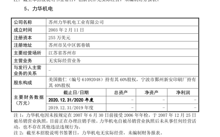 据招股书披露,欧圣电气实控人陆为东曾控制的力华机电于2007年被吊销营业执照,该公司成立于2003年2月11日,由美国傲仁(编号61092048)持有其60%股权,宁波市鄞州新安印刷厂(以下简称“新安印刷厂”)持有其40%股权。而美国傲仁为陆为东曾经控制企业,陆为东对其持股比例为100%,美国傲仁于2020年6月9日解散。