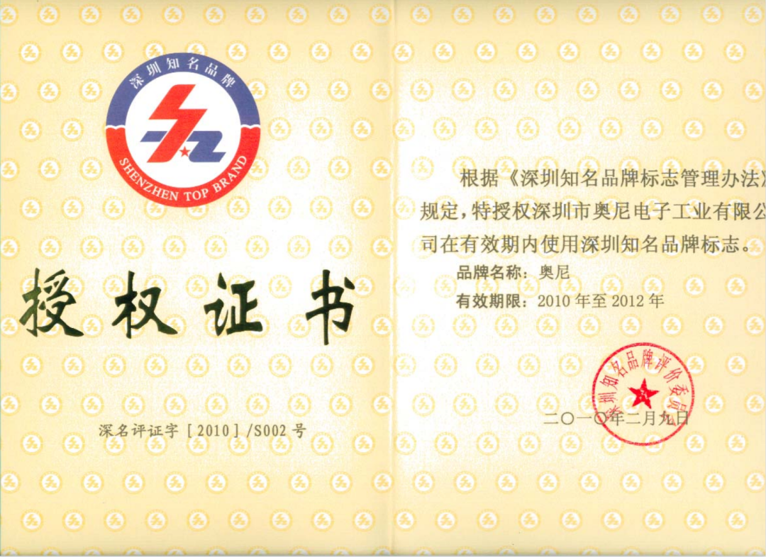 “深圳知名品牌”培育评价活动是2003年4月市政府发布深府〔2003〕64号文件,明确委托深圳工业总会具体组织开展的一项推动企业做品牌、创名牌活动,迄今已持续开展十九届。奥尼电子于2009年正式入选第七届深圳知名品牌榜单,多次顺利通过“3年1次”复审,连续13年享有“深圳知名品牌”称号。