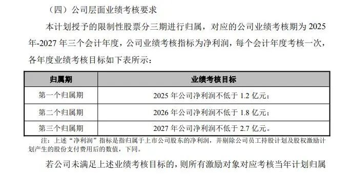 具体考核目标为:2025年公司净利润不低于1.2亿元;2026年公司净利润不低于1.8亿元;2027年公司净利润不低于2.7亿元。