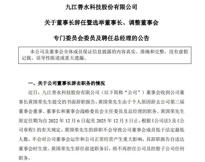11月7日,善水科技发布公告称,近日,董事会收到黄国荣提交的书面辞职报告,黄国荣由于个人原因辞去公司第三届董事会董事、董事长和董事会战略委员会主任委员及总经理的职务。