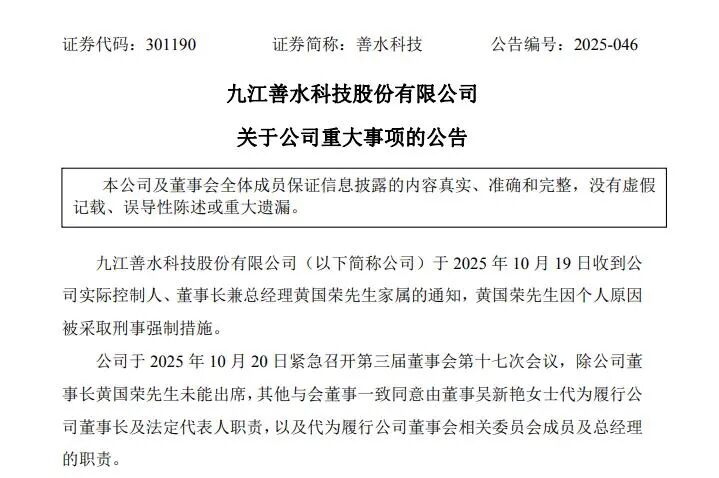 10月20日晚间,善水科技发布公告显示,公司于当日收到公司实际控制人、董事长兼总经理黄国荣家属的通知,黄国荣因个人原因被采取刑事强制措施。