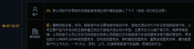 在互动平台上,泰祥股份披露了公司的汽车零部件在新能源领域应用的品牌。其中提到,宏马科技目前已涉及新能源汽车逆变器壳体等方面的零部件,具体包括大众MEB平台FSW逆变器壳体、吉利逆变器壳体、保时捷逆变器壳体、富奥逆变器壳体等,最终配套客户为上汽大众、一汽-大众、吉利、上汽、红旗等新能源汽车品牌。