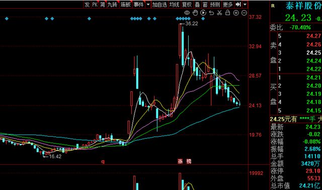 8月7日午间收盘,泰祥股份报价24.23元,微跌0.08%,总市值24.21亿元。