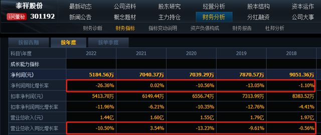 拉长时间来看,2018年至2021年,泰祥股份营收从1.97亿元下降至1.60亿元,净利润从9051万元下降至7040万元,增长停滞甚至是负增长。