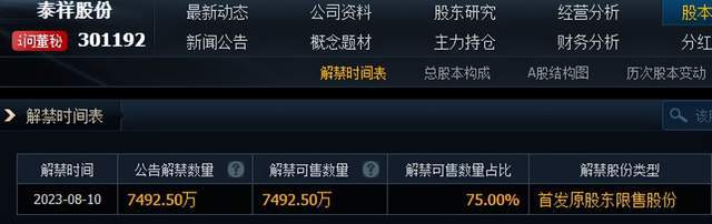 8月10日,泰祥股份将迎来高比例限售股解禁,解禁数量7492.5万股,占总股本(9990万股)比例75%,解禁股份类型为首发原股东限售股份。