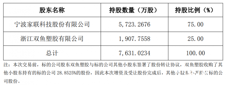 5月5日,家联科技发布公告,公司拟以4500万元的价格受让双鱼塑胶持有的浙江家得宝科技股份有限公司45%的股权;同时以1.2亿元认购家得宝本次增发的4162.37万股股份。本次增发完成后,公司持有家得宝75%的股权,家得宝将成为公司的控股子公司。