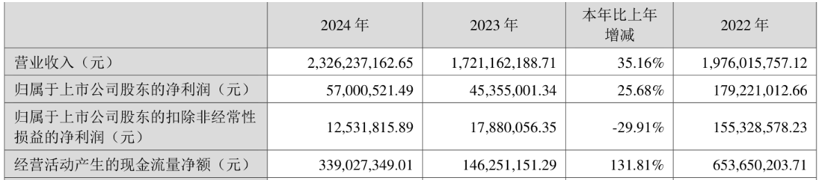 2024年,公司实现营业收入23.26亿元,同比增长35.16%;归属于上市公司股东的净利润5700.05万元,同比增长25.68%;归属于上市公司股东的扣非净利润1253.18万元,同比下降29.91%;经营活动产生的现金流量净额为3.39亿元,同比增长131.81%。