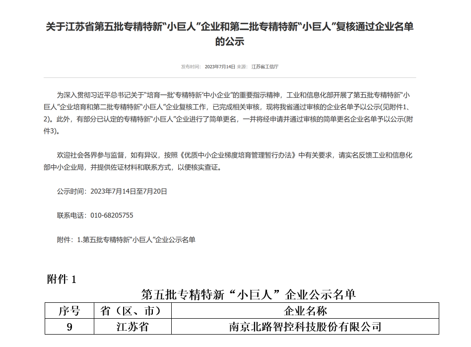 近日,工信部发布了第五批国家级专精特新“小巨人”企业名单,南京北路智控科技股份有限公司(以下简称“北路智控”)成功入选,公示阶段已结束,这充分展示了北路智控在科技成果转化等方面所取得的成效,彰显了北路智控在所属行业细分领域的创新力和竞争力。