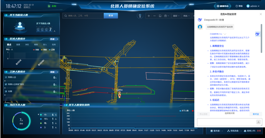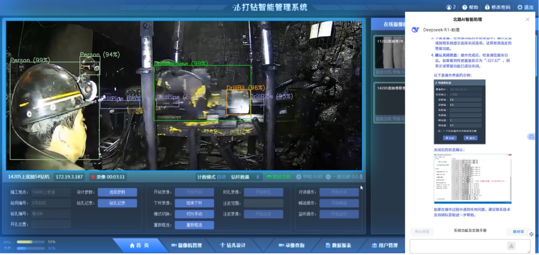 DeepSeek作为新出现的AI大模型,具备更卓越的数据处理、分析以及决策能力。它能够快速理解并处理复杂信息,提供更精准的预测和智能的建议。通过集成DeepSeek技术,北路智控为旗下十大类系统产品都量身打造了专属的AI解决方案,在矿业知识、行业规范、法规遵循、操作流程、案例研究、智能运维等领域,展现了其卓越的应用潜力。