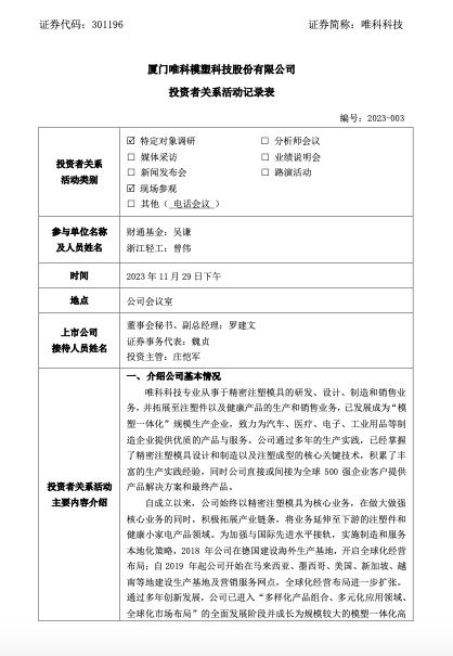 唯科科技向投资者介绍了公司基本情况。唯科科技专业从事于精密注塑模具的研发、设计、制造和销售业务,并拓展至注塑件以及健康产品的生产和销售业务,已发展成为“模塑一体化”规模生产企业,致力为汽车、医疗、电子、工业用品等制造企业提供优质的产品与服务。公司通过多年的生产实践,已经掌握了精密注塑模具设计和制造以及注塑成型的核心关键技术,积累了丰富的生产实践经验,同时公司直接或间接为全球500强企业客户提供产品解决方案和最终产品。