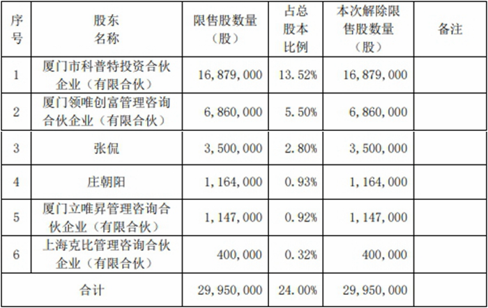 唯科科技本次解除限售股份数量为29,950,000股,占唯科科技总股本的24.00%。本次申请解除股份限售的股东共计6名,其中自然人股东2名,分别为张侃、庄朝阳;境内机构股东4名,厦门市科普特投资合伙企业(有限合伙)、厦门领唯创富管理咨询合伙企业(有限合伙)、厦门立唯昇管理咨询合伙企业(有限合伙)、上海克比管理咨询合伙企业(有限合伙)。