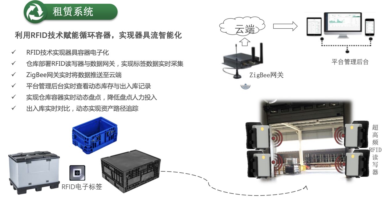 2016年,喜悦智行利用UHF RFID技术赋能循环包装容器,实现包装器具流转智能化。在各个仓库部署RFID读写器与ZigBee数据网管,实现资产数据的实时采集到云端管理平台。