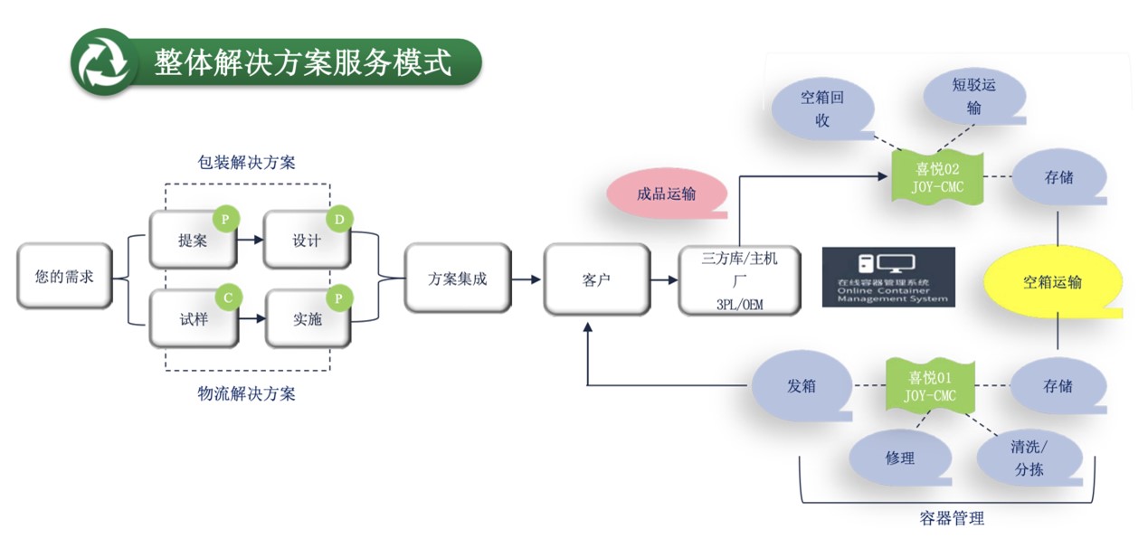 2015年,喜悦智行启动循环包装租赁业务,先后在上海、太仓、无锡、宁波、合肥、芜湖等全国50多个城市建立城市分仓,以次构建起覆盖全国范围内的循环包装回收循环体系,与客户的供应链体系对接,形成循环包装完整的服务链路。