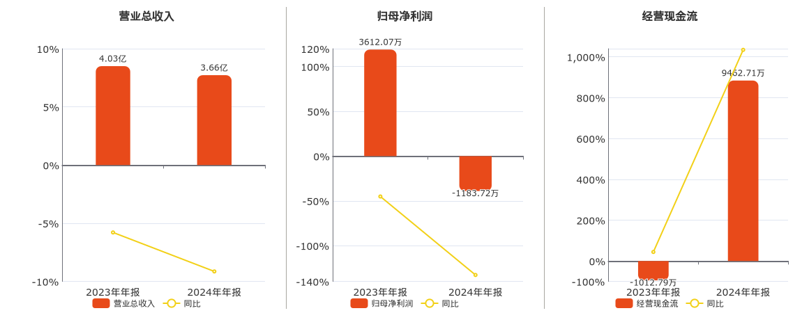 公司营业总收入为3.66亿元,较去年同报告期营业总收入减少3685.40万元,同比较去年同期下降9.14%。归母净利润为-1183.72万元,较去年同报告期归母净利润减少4795.79万元,同比较去年同期下降132.77%。经营活动现金净流入为9462.71万元。