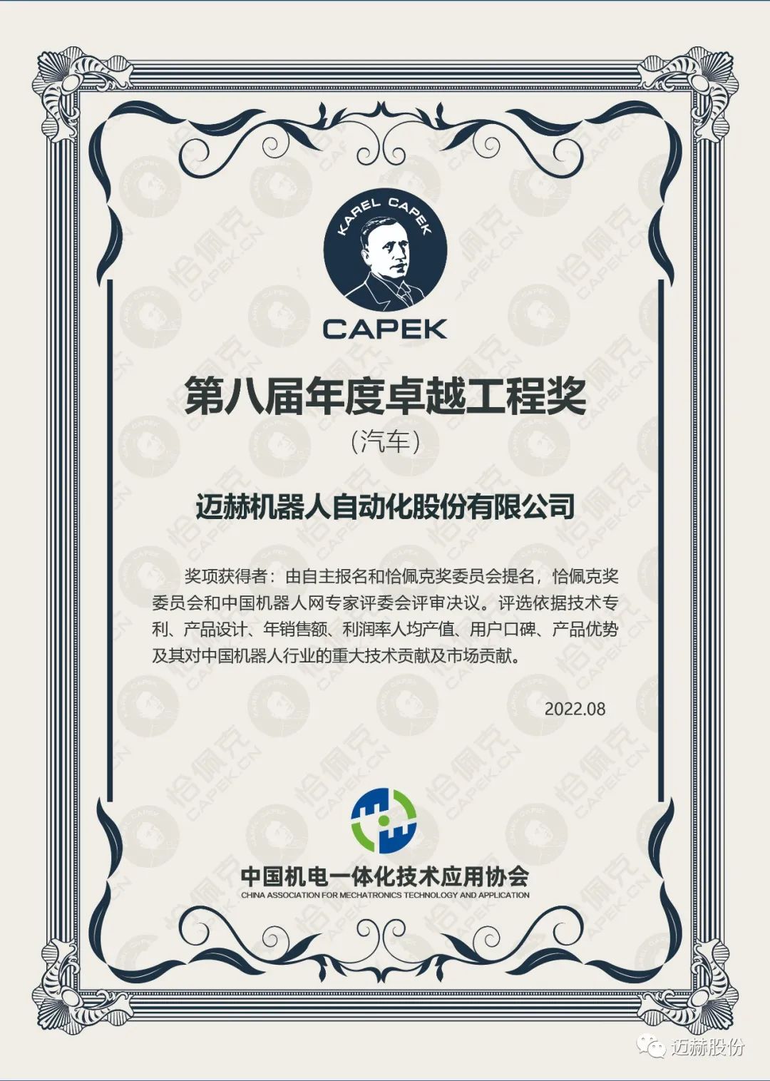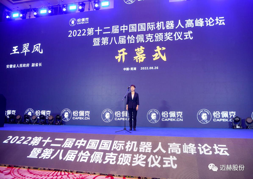 2022年8月26日,迈赫股份作为“第八届恰佩克年度卓越工程奖”获得者,受邀参加“2022第十二届中国国际机器人高峰论坛暨第八届恰佩克颁奖仪式”,并与机器人及智能制造领域顶尖专家、企业高管、行业精英700余人齐聚芜湖,一起共话创新、共谋未来。