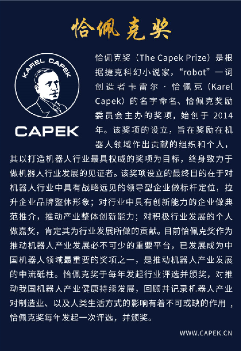恰佩克奖创立于2014年,旨在致力于做机器人行业发展的见证者,打造机器人行业的“诺贝尔”。该奖项的设立,旨在对机器人行业中具有战略远见的领导型企业做标杆定位,拉升产业品牌整体格局;对行业中具有创新能力的企业做典范推介,推动产业整体创新能力;对积极行业发展的个人做嘉奖,肯定其为行业发展所做的贡献。在中国范围内,恰佩克奖通常被认为是机器人领域内最重要的奖项。