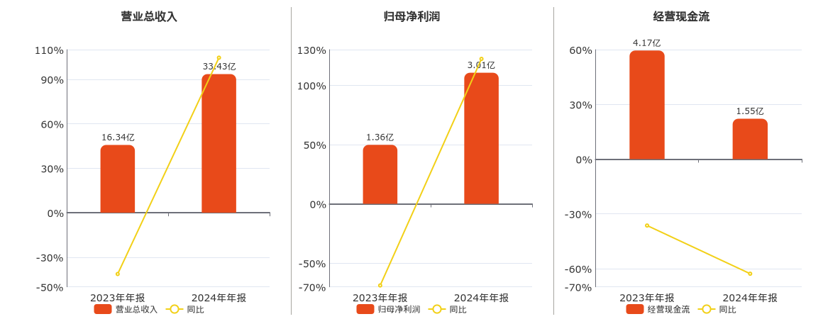 公司营业总收入为33.43亿元。归母净利润为3.01亿元。经营活动现金净流入为1.55亿元,较去年同报告期经营活动现金净流入减少2.62亿元,同比较去年同期下降62.81%。